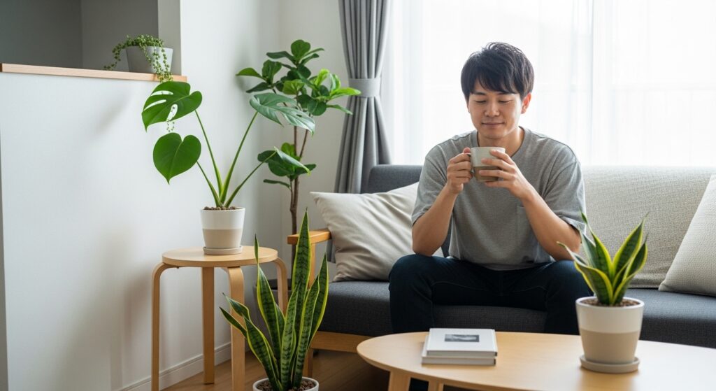 シンプルなお部屋だからこそ、植物や雑貨で温かみをプラスするのがおすすめです。観葉植物は、部屋に自然の癒しをもたらし、心地よい暮らしを演出してくれます。初心者には、多肉植物やサボテンなどのお手入れが簡単なものが人気です。