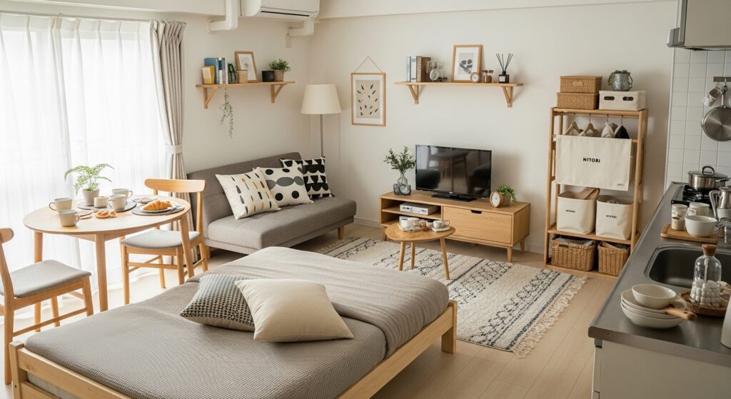 あくまで目安ですが、ベッド、寝具、カーテン、小さなテーブル、ラグ、基本的なキッチン用品をニトリで全てゼロから揃えた場合、およそ5万円〜10万円程度が相場となります。