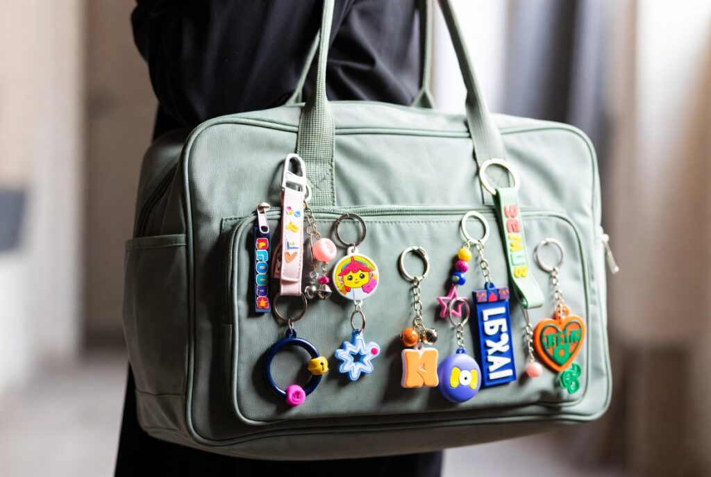 • スクールバッグに大量のキーホルダーをつける(ジャラ付け)